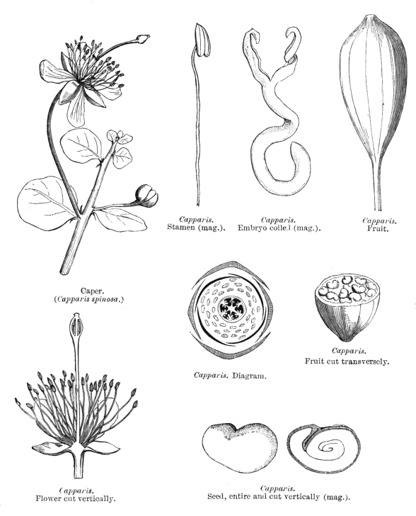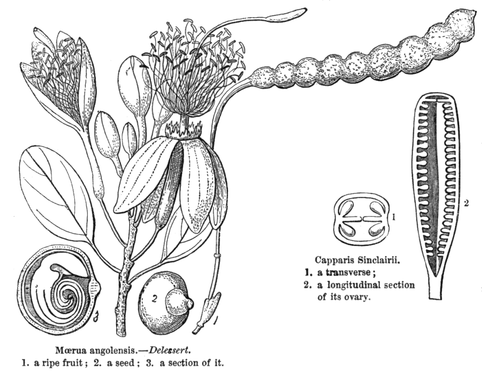 Taxonomy. Subclass Dicotyledonae; Crassinucelli. Dahlgren's Superorder Violiflorae; Capparales. Cronquist's Subclass Dilleniidae; Capparales. Takhtajan's Subclass Dilleniidae; Dillenianae; Capparales. Species 650. Genera about 26; Apophyllum, Bachmannia, Belencita, Borthwickia, Boscia, Buchholzia, Cadaba, Capparis, Cladostemon, Crateva, Dactylaena, Dipterygium (or Cruciferae?), Euadenia, Forchhammeria, Maerua, Morisonia, Neothorelia, Podandrogyne, Poilanedora(?), Puccionia (or Cruciferae?), Ritchiea, Setchellanthus, Steriphoma, Stixis, Thilachium, Tirania.