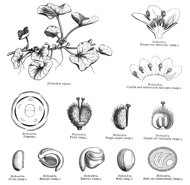 Taxonomy. Subclass Dicotyledonae; Tenuinucelli. Dahlgren's Superorder Solaniflorae; Solanales. Cronquist's Subclass Asteridae; Solanales. Takhtajan's Subclass Asteridae; Lamianae; Polemoniales. Species 1650. Genera about 55; Aniseia, Argyreia, Astripomoea, Blinkworthia, Bonamia, Breweria, Calycobolus, Calystegia, Cardiochlamys, Cladistigma, Convolvulus, Cordisepalum, Cressa, Decalobanthus, Dichondra, Dicranostyles, Dinetus, Dipteropeltis, Ericybe, Evolvulus, Falckia, Hewittia, Hildebrandtia, Hyalocystis, Ipomoea, Iseia, Itzaea, Jacquemontia, Lepistemon, Lepistemonopsis, Lysiostyles, Maripa, Merremia, Metaporana, Nephrophyllum, Neuropeltis, Neuropeltopsis, Odonellia, Operculina, Paralepistemon, Pentacrostigma, Pharbitis, Polymeria, Porana, Poranopsis, Rapona, Rivea, Sabaudiella, Seddera, Poranopsis, Rapona, Rivea, Sabaudiella, Seddera, Stictocardia, Stylisma, Tetralocularia, Tridynamia, Turbina, Wilsonia, Xenostegia.