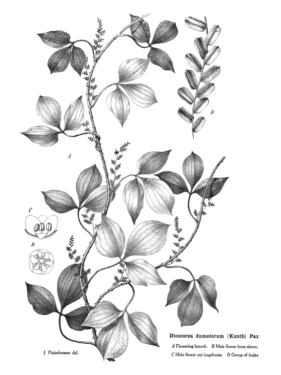 Habit and leaf form. Shrubs, or herbs, or lianas. Rhizomatous, or tuberous (the tubers giving rise to annual stems). Climbing (usully), or self supporting (rarely); mostly stem twiners, or scrambling (or trailing). Mesophytic, or xerophytic. Leaves alternate (usually), or opposite (rarely); usually spiral; petiolate; sheathing to non-sheathing; simple (usually), or compound; when compound, palmate (with three to six or more leaflets). Lamina entire (usually), or dissected (occasionally); when incised, palmately lobed; basically palmately veined; cross-venulate; often cordate, or sagittate. Leaves stipulate, or exstipulate.