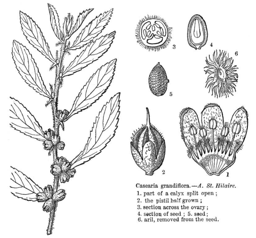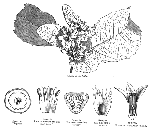 Taxonomy. Subclass Dicotyledonae; Crassinucelli. Dahlgren's Superorder Violiflorae; Violales. Cronquist's Subclass Dilleniidae; Violales. Takhtajan's Subclass Dilleniidae; Dillenianae; Violales. Species 1000. Genera about 90; Abatia (~ Passifloraceae), Ahernia, Aphaerema (~ Passifloraceae), Azara, Baileyoxylon, Banara (~ Tiliaceae), Bartholomaea, Barteria, Bembicia, Bennettiodendron, Berberidopsis, Buchnerodendron, Byrsanthus, Calantica, Caloncoba, Camptostylus, Carpotriche, Carrierea, Casearia, Chiangiodendron, Chlorocarpa, Dasylepis, Dissomera, Dovyalis, Eleutherandra, Erythrospermum, Euceraea, Flacourtia, Gerardina, Grandidiera, Gynocardia, Hasseltia (~ Tiliaceae), Hasseltiopsis (~ Tiliaceae), Hecatostemon, Hemiscolopia, Homalium, Hydnocarpus, Idesia, Itoa, Kiggelaria, Laetia, Lasiochlamys, Lindackeria, Ludia, Lunania, Macrohasseltia (~ Tiliaceae), Mayna, Mocquerysia, Neopringlea, Neoptychocarpus, Neosprucea (~ Tiliaceae), Olmediella, Oncoba, Ophiobotrys, Osmelia, Pangium, Paropsia, Peterodendron, Phyllobotryon, Phylloclinium, Pineda (~ Tiliaceae), Pleuranthodendron, Poggea, Poliothyrsis, Priamosia, Prockia (~ Tiliaceae), Prockiopsis, Pseudoscolopia, Pseudosmelia, Rawsonia, Ryania, Ryparosa, Samyda, Scaphocalyx, Scolopia, Soyauxia, Streptothamnus, Tetrathylacium, Tisonia, Trichadenia, Trichostephanus, Trimeria, Xylosma, Xylotheca, Zuelania.