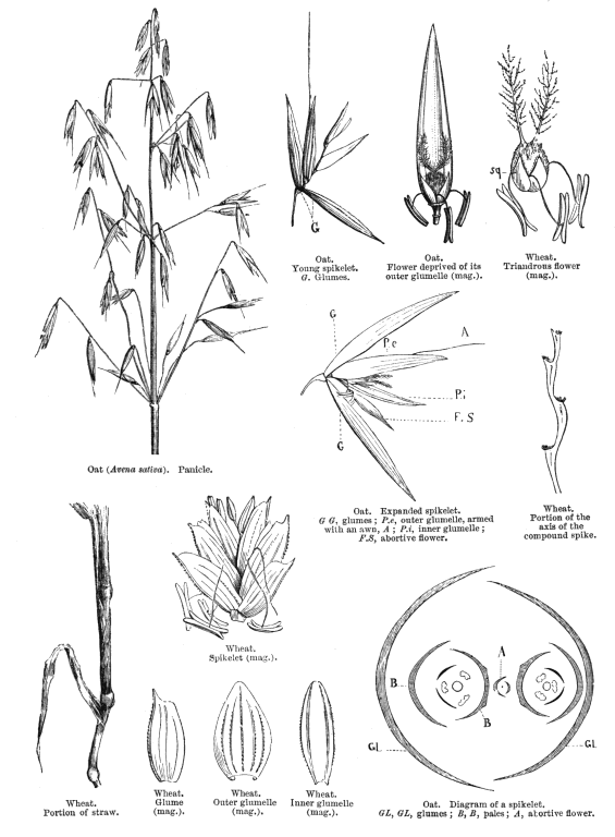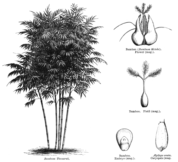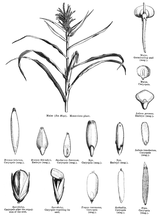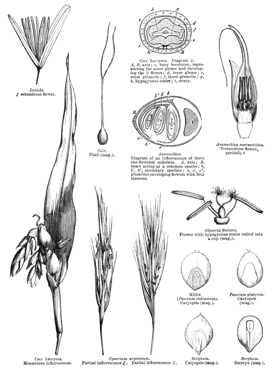 Including Andropogonaceae (J. Presl) Herter, Anomochloaceae Nak., Avenaceae (Kunth) Herter, Bambusaceae Nak., Eragrostidaceae (Benth.) Herter, Lepturaceae (Benth.) Herter, Miliaceae Burnett, Oryzaceae (Kunth) Herter, Panicaceae (R. Br.) Herter, Pappophoraceae (Kunth) Herter, Parianaceae (Hack.) Nak., Phalaridaceae Burnett, Spartinaceae Burnett, Sporobolaceae (Stapf) Herter, Stipaceae Burnett, Streptochaetaceae (C.E. Hubb.) Nak.