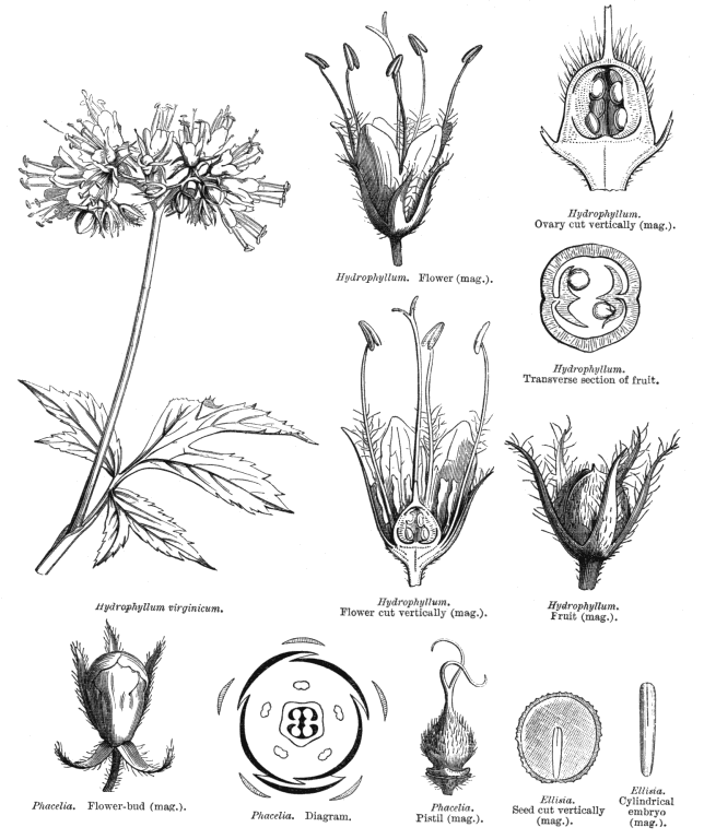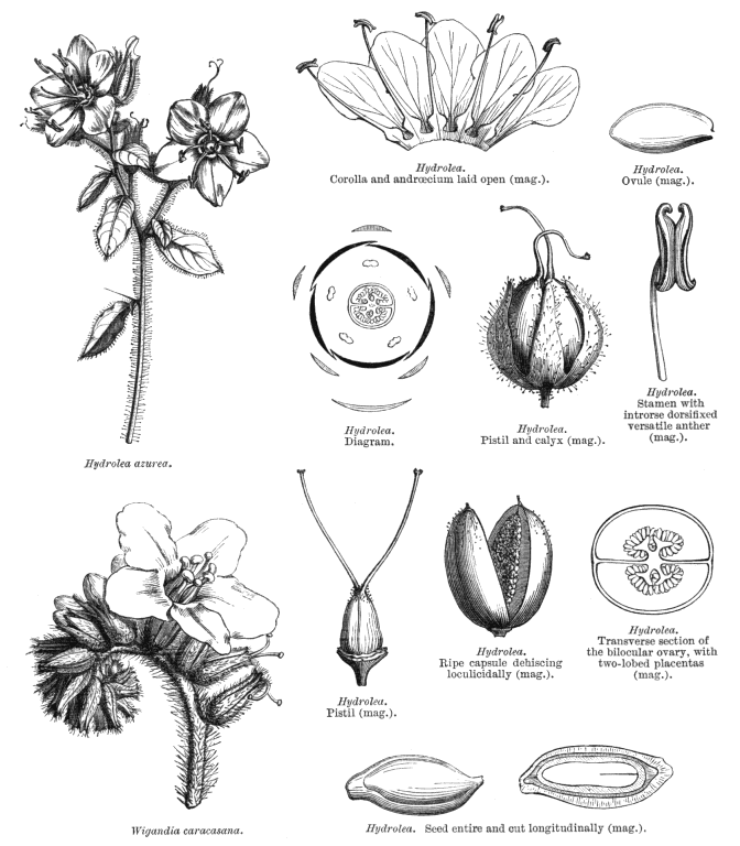 Taxonomy. Subclass Dicotyledonae; Tenuinucelli. Dahlgren's Superorder Solaniflorae; Boraginales. Cronquist's Subclass Asteridae; Solanales. Takhtajan's Subclass Asteridae; Lamianae; Polemoniales. Species 250. Genera 17; Codon, Draperia, Ellisia, Emmenanthe, Eriodictyon, Eucrypta, Hesperochiron, Hydrolea, Hydrophyllum, Nama, Nemophila, Phacelia, Pholistoma, Romanzoffia, Tricardia, Turricula, Wigandia.