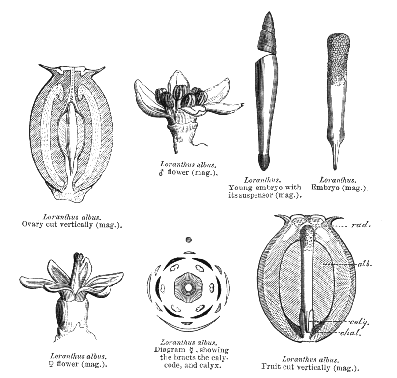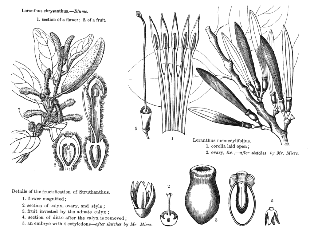 Taxonomy. Subclass Dicotyledonae; Crassinucelli. Dahlgren's Superorder Santaliflorae; Santalales. Cronquist's Subclass Rosidae; Santalales. Takhtajan's Subclass Rosidae; Celastranae; Santalales. Species 940. Genera about 70; Actinanthella, Aetanthus, Agelanthus, Alepis, Amyema, Amylotheca, Atkinsonia, Bakerella, Baratranthus, Benthamina, Berhautia, Cecarria, Cladocolea, Cyne, Dactyliophora, Decaisnina, Dendropemon, Dendropthoe, Desmaria, Diplatia, Distrianthes, Elytranthe, Emelianthe, Englerina, Erianthemum, Gaiadendron, Globimetula, Helicanthes, Helixanthera, Ileostylus, Ixocactus, Kingella, Lampas, Lepeostegeres, Lepidaria, Ligaria, Loranthus, Loxanthera, Lysiana, Macrosolen, Moquiniella, Muellerina, Notanthera, Nuytsia, Oliverella, Oncella, Oncocalyx, Oryctanthus, Oryctina, Panamanthus, Papuanthes, Pedistylis, Peraxilla, Phragmanthera, Phthirusa, Plicosepalus, Psittacanthus, Scurrula, Septulina, Socratina, Sogerianthe, Spragueanella, Struthanthus, Tapinanthus, Taxillus, Tetradyas, Thaumasianthes, Tolypanthus, Trilepidea, Tripodanthus, Tristerix, Trithecanthera, Tupeia, Vanwykia.