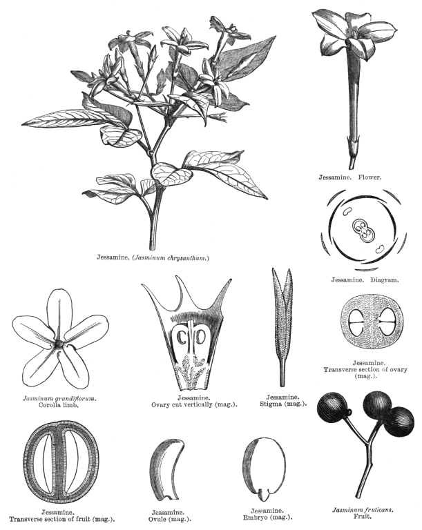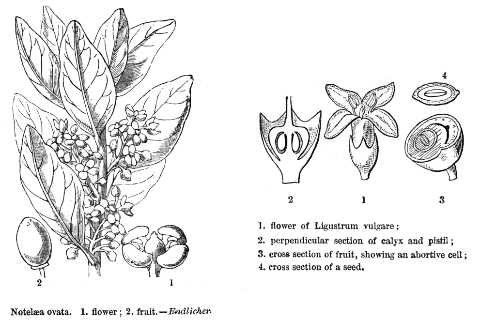 Taxonomy. Subclass Dicotyledonae; Tenuinucelli. Dahlgren's Superorder Gentianiflorae; Oleales. Cronquist's Subclass Asteridae; Solanales. Takhtajan's Subclass Asteridae; Gentiananae; Oleales. Species 900. Genera about 25; Abeliophyllum, Chionanthus, Comoranthus, Fontanesia, Forestiera, Forsythia, Fraxinus, Haenianthus, Hesperelaea, Jasminum, Ligustrum, Linociera, Menodora, Myxopyrum, Nestegis, Noronhia, Noronhia, Notelaea, Olea, Osmanthus, Phyllyrea, Picconia, Schrebera, Syringa Tessarandra.