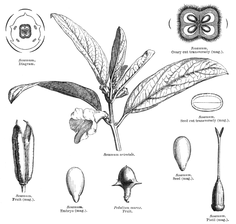 Taxonomy. Subclass Dicotyledonae; Tenuinucelli. Dahlgren's Superorder Lamiiflorae; Scrophulariales. Cronquist's Subclass Asteridae; Scrophulariales. Takhtajan's Subclass Asteridae; Lamianae; Scrophulariales. Species 50. Genera 13; Ceratotheca, Dicerocaryum, Harpagophytum, Holubia, Josephinia, Linariopsis, Pedaliodiscus, Pedalium, Pterodiscus, Rogeria, Sesamothamnus, Sesamum, Uncarina.