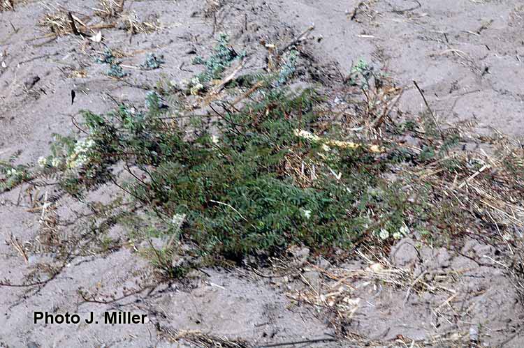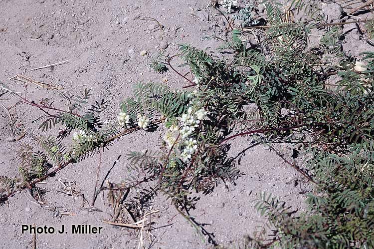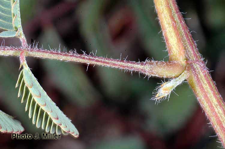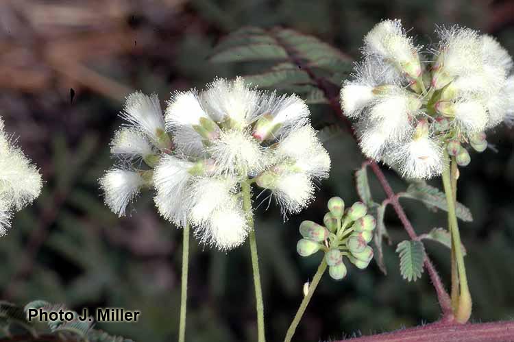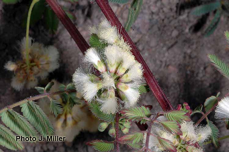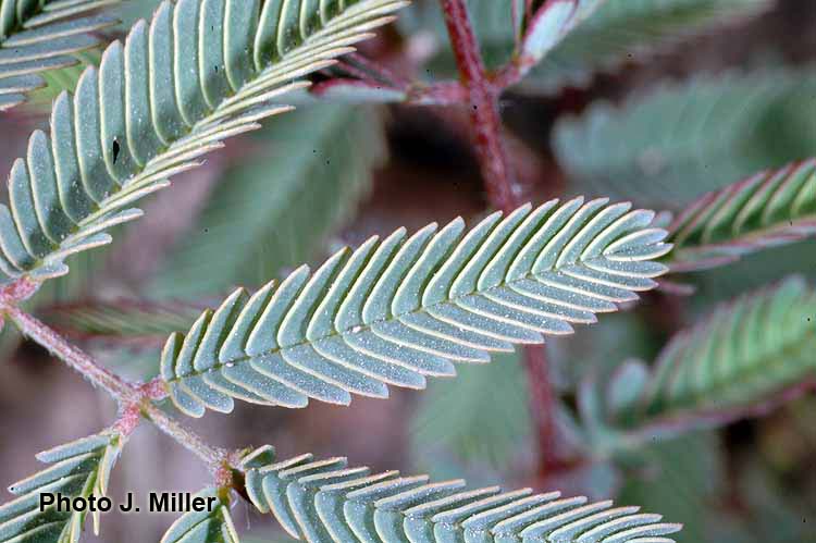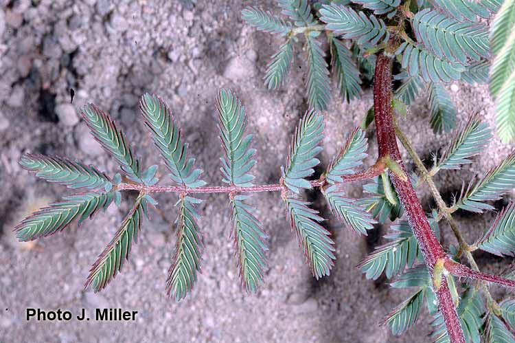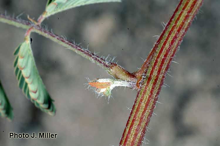 Prostrate perennial herb or occasionally shrub to 3.5 m tall, yellow-hirsute, glabrescent. Stipules persistent, narrowly lanceolate, 6-7 mm long, pilose, margin longciliate. Leaves (4)8-10(15) cm long; petiole 1-1.5(3) cm long, terete, sparsely hirsute; rachis (0.8)6.5-7(9.5) cm long, sparsely hirsute, with (2)6-8 pairs of pinnae; pinnae 2.3-3.5(5.5) cm long; paraphyllidia 0.75-1 mm long; leaflets (6)15-20 pairs per pinna, 3-6 × 1.5-2 mm, elliptic, base truncate, apex rounded, the brochidodromous venation evident on the lower surface, inconspicuous above, midvein subcentral, glabrous, margin long-ciliate, membranaceous. Inflorescences consisting of clusters of (2)4-5 axillary, capitulum-like racemes; peduncles (1.8)2.5-3(5) cm long; usually glabrous or sparsely hirsute, without pearl glands; inflorescence bracts 2, one near to the inflorescence base, 1 mm long, the other about 1/3 up the peduncle, 2 mm long, both bracts glabrous, with margins long-ciliate, elliptic in shape, fugacious; floral bract 1 mm long, glabrous, long-ciliate, clavate, fugacious; pedicels 1 mm long, glabrous; flowers white, drying pink to orange; racemes 1-1.5 cm in diam. at anthesis. Calyx (0.75)1.2 mm long, 5-lobed, the lobes less than ¼ the length of the whole calyx, glabrous or slightly ciliate. Corolla 2.5-3 mm long, 5-lobed, lobes to more than half the whole corolla length, glabrous. Stamens 5 mm long. Ovary 0.75- 0.8 mm long, glabrous, short-stipitate, the stipe 0.25 mm long, much shorter than the ovary; basal nectary 0.25-0.7 mm high. Legume 4-6 × 0.9-1.2 × 0.2 cm (immature), flat, straight; valves chartaceous, reticulateveined, reddish brown, glabrescent, acute at apex; stipe 1.9 cm long; beak < 0.5 mm long. Seeds 3-6 per pod, not seen mature.